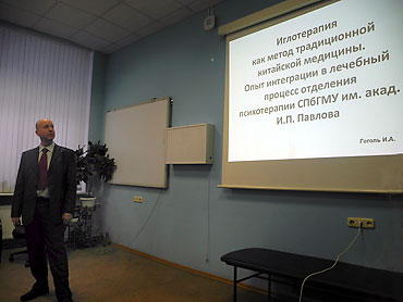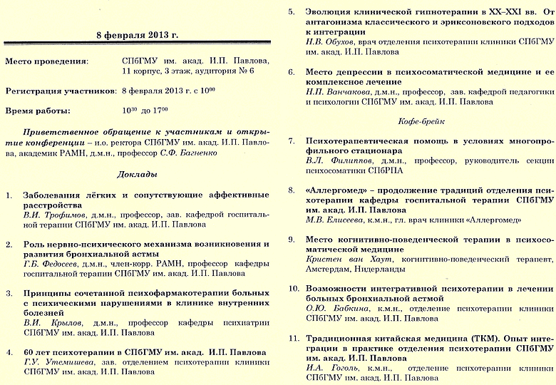 В рамках конференции прозвучали доклады ведущих современных специалистов в области психиатрии, психотерапии и психосоматической медицины, а также сотрудников отделения психотерапии клиники СПбГМУ им. акад. И.П. Павлова. Научно-практическая конференция прошла под лозунгом интегративности как собственно в психотерапии, так и в медицине вообще, как новейшей тенденции в медицинской науке и практике. Особое внимание было уделено проблемам психосоматической медицины. Так в докладе член-корреспондента РАМН, профессора Г.Б. Федосеева были представлены современные, как собственные, так и зарубежные исследования, демонстрирующие психосоматические патогенетические корреляции в развитии бронхиальной астмы. Профессор В.И. Крылов в своем докладе подчеркнул возрастание частоты аффективных расстройств в клинике внутренних болезней и необходимость комплексного подхода к терапии этих пациентов. Также он отметил особую значимость корректной диагностики этих расстройств и совершенствования понятийного аппарата в этой сфере. Профессор Н.П. Ванчакова остановилась на необходимости тесного взаимодействия интернистов с психиатрами и психотерапевтами и повышения уровня знаний врачей обшей практики в области психиатрии и психотерапии. Профессор В.Л. Филиппов говорил о важности организации психосоматических отделений на базе многопрофильных стационаров. Кроме того, были представлены доклады о продолжении традиций отделения психотерапии и иглорефлексотерапии в медицинских учреждениях Петербурга. Также зарубежные гости поделились историей развития интегративной психотерапии в Нидерландах и месте когнитивно-поведенческих методов в структуре интегративного подхода. Вторая часть конференции была посвящена роли профессора П.И. Буля в развитии психотерапии в России и мире, сохранению и развитию его научного и творческого наследия. П.И. Буль – доктор медицинских наук, профессор, психотерапевт, почетный член Пражской, Берлинской и Парижской Академии наук, автор трех монографий, не раз переиздававшиеся у нас и за рубежом, 150-ти печатных работ на французском, английском, немецком языках. Во второй части конференции большое внимание было уделено также практической, научной и образовательной деятельности отделения психотерапии клиники СПбГМУ. Заведующая отделением Г.У. Утемишева со своими сотрудниками представили широкий обзор того, как развивалась психотерапевтическая служба Университета, какова структура отделения в настоящее время, его практическая и научная направленность и значение для Университета и города. С большим интересом были встречены выступления сотрудников отделения к.м.н. О.Ю. Бабкиной о роли психотерапии в лечении пациентов с БА (бронхиальной астмой), к.м.н. И.А. Гоголя об интеграции методов традиционной медицины в практику отделения, Н.В. Обухова об интеграции классического и эриксоновского гипноза.